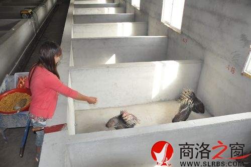 酷暑7月,記者走進(jìn)柞水,樹木蔥綠,小河清澈的蘆柴溝,清晨依然涼爽。董秀斌的秦嶺豪豬養(yǎng)殖農(nóng)場就坐落在山清水秀的車家河村一組,占地700平方米。走進(jìn)嶄新的養(yǎng)殖場,一股山林野生動物的腥味彌漫整個場房,一個個隔離開來的“小包間”就是豪豬的豬舍。董秀斌的妻子連明珍正在精心飼養(yǎng)著這些帶刺的寶貝,一只只豪豬聽見有人走近,趕緊躲在角落里。