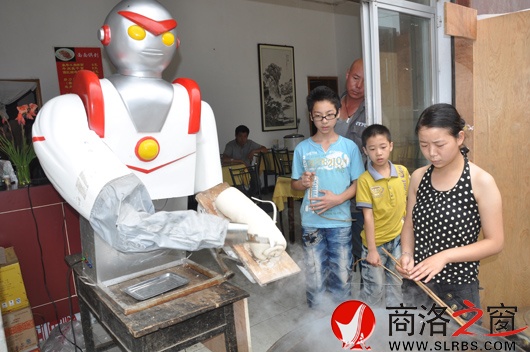 本網(wǎng)訊 近日,洛南縣一家餐館推出“機(jī)器人刀削面”,引來了諸多好奇的目光和絡(luò)繹不絕的食客。據(jù)經(jīng)營(yíng)者介紹,削面機(jī)器人是他花費(fèi)兩萬元從北京購(gòu)買的,因這位“伙計(jì)”削出的面長(zhǎng)短薄厚均勻、口感勁道,吸引了眾多食客。(冀希亮/攝)