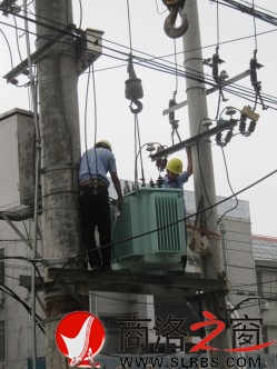 本網訊 (劉春榮)8月2日晚,丹鳳縣城突遭暴雨襲擊導致全縣城停電,為不影響市民看奧運的熱情,電力部門立即組織人力連夜進行搶修。圖為8月3日黎明時分電力部門人員仍在城區(qū)搶修更換變壓器。