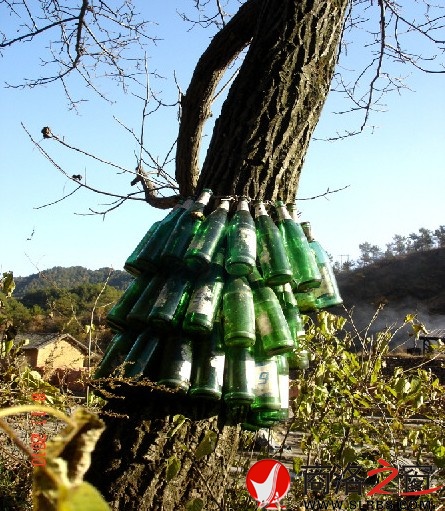 然而,在廣大農(nóng)村,政府部門進行平安創(chuàng)建的宣傳教育,嚴禁投放滅兔、滅鼠等有毒藥物,嚴禁私自布控電網(wǎng),亂放電貓,亂投鋼夾等,一些果農(nóng)就想出了防兔防鼠的新招數(shù)。他們在田間地頭安裝了稻草假人,在稻草人的胳膊上還纏一些隨風(fēng)飄動且能發(fā)響的風(fēng)鈴等。一些村民還找來廢舊的酒瓶,在核桃樹上用鐵絲一圈圈的捆扎起來,老鼠們想上樹偷吃果實,須從樹干上向上溜,由于酒瓶是玻璃材質(zhì)而且光滑,老鼠們怎樣爬也是怕不上去的。為防止老鼠從空隙鉆,酒瓶圍繞的圈數(shù)就得增多,這樣,遠遠看去,就好像給大樹穿上了“酒瓶時裝”一樣。