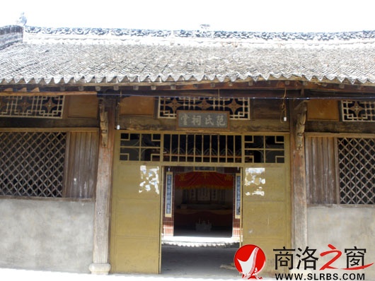 二進(jìn)為正殿,前檐為開放形,有柱無(wú)門,兩柱外各有高約1.5米漢白玉石獅一尊(原石鼓一對(duì)被拆),內(nèi)側(cè)有瓷磚鑲“文武世第名宦家聲,金玉世澤將相家聲”對(duì)聯(lián),橫批“高平堂”;前檐自西向東,一排立有“咸豐五年歲次乙卯仲春月吉日,范永勝立,五世八房同居助力修建”青石碑一座,上有陰陽(yáng)、石工、木工、畫工、窯工姓名;“咸豐五年歲次乙卯春月吉日”棉石碑一座,概述祖先來(lái)此年代、發(fā)家史及修祠緣由,并書十五代——十七代子輩職務(wù)、名號(hào),最下行為十七代孫名號(hào);中立有“清同治13年歲在甲戌孟冬月八房公義重修祠堂”碑,此碑高約2.3米,寬1米余,厚10公分,底座為長(zhǎng)1米、厚高均1尺余梯形青石,從現(xiàn)狀看,因其高大,138年間未曾動(dòng)過(guò);正面為十六世、十八世排位、修祠經(jīng)手名;背面詳敘家族發(fā)展史、購(gòu)地面積、四址及訓(xùn)誡子孫“十要”,字跡工整,清秀;“八房支脈”2003年清明立碑一座。二排西有“長(zhǎng)房支脈”2003年清明立碑一座;東有“七房支脈”2012年冬至立碑一座。西山墻懸掛約10平方米,紅綢鑲邊杏黃綢“范氏商洛分支列祖列宗族譜”。正殿中央掛“范氏歷代堂上宗祖之神位”,旁配“先祖本居安慶府,承芳繁衍商洛山”和“創(chuàng)業(yè)維艱勿忘祖宗恩德,治家非易銘記先人垂訓(xùn)”雙對(duì)聯(lián),(原聯(lián)“派演姑蘇一老子 統(tǒng)承忠恕兩行書”),下設(shè)3米長(zhǎng)香案,堂前橫梁紅綢黃字“高平堂”做橫批,兩邊掛紅綢垂幅,重書“門柱聯(lián)”。房中檁為原有,兩支座為半圓形雕花木座,華貴大氣;西間后檐房椽屬原有,前檐及其余兩間房椽新?lián)Q,從前檐到后檐,東西各有4根中柱,使房屋結(jié)實(shí)堅(jiān)久。
