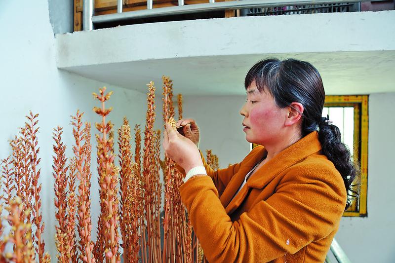 2019年,之前的付出終于得到了回報。當(dāng)年,方海燕家收獲了3萬斤商品麻和1萬斤小種麻,總共4萬斤的天麻讓夫妻倆嘗到了豐收的喜悅。在發(fā)展產(chǎn)業(yè)的道路上,夫妻倆不滿足僅僅是種植天麻,還搞起了配套產(chǎn)業(yè)。2014年10月,他們成立鎮(zhèn)安縣匯金菌業(yè)培植專業(yè)合作社,帶領(lǐng)村民共同發(fā)展天麻產(chǎn)業(yè)。2016年,他們投資70多萬元建了廠房,從育種、養(yǎng)菌到種植,方海燕和丈夫?qū)崿F(xiàn)了產(chǎn)業(yè)一條龍。僅密環(huán)菌每年就可以生產(chǎn)20萬瓶,銷售額達(dá)50萬元。由于培育的天麻種可靠,很多種植戶從她家買種和密環(huán)菌,銷售渠道也越來越廣,天麻和種苗齊頭并進(jìn),實現(xiàn)了一項產(chǎn)業(yè)多重收入。自家致富的同時,他們還在村里大力推廣天麻種植。50多歲的程緒德2016年還是貧困戶,經(jīng)過方海燕上門推廣,加上技術(shù)指導(dǎo),第一次種了1畝地約400窩的天麻,到了2018年,依靠種天麻實現(xiàn)了脫貧,去年靠種天麻收入了3萬多元,今年他家的種植規(guī)模已達(dá)800窩。