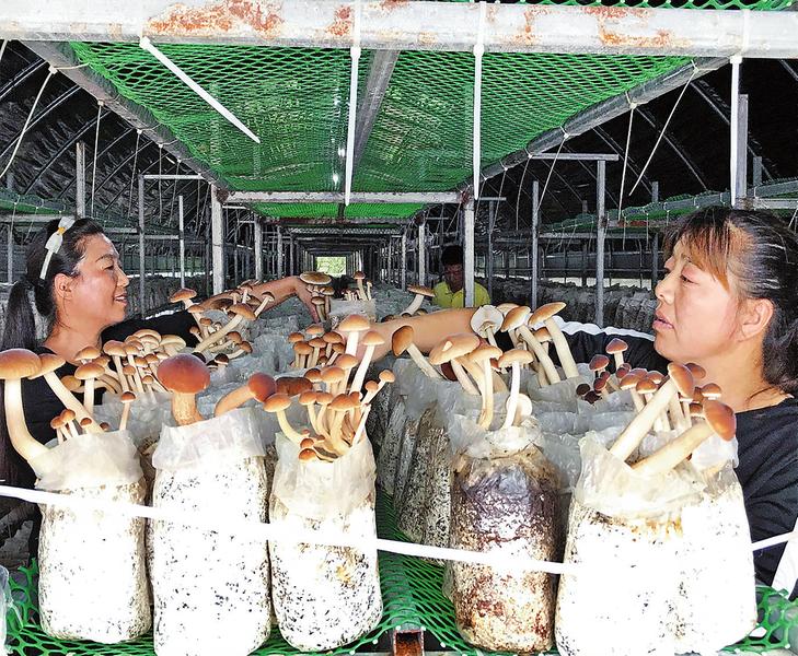 峰巒疊翠,樹木蔥蘢。8月6日,在位于西華村小木嶺上的鋤禾農(nóng)業(yè)公司茶樹菇生產(chǎn)大棚里,村民馬進琴正和同事忙著采摘鮮菇。