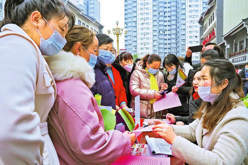 2月26日,丹鳳縣在鳳冠新城易地安置小區(qū)舉辦2021年“春風(fēng)行動(dòng)”縣域內(nèi)重點(diǎn)企業(yè)用工專場(chǎng)招聘會(huì),26家企業(yè)和8家人力資源公司提供縣內(nèi)就業(yè)崗位2800個(gè)、縣外就業(yè)崗位6000個(gè),現(xiàn)場(chǎng)達(dá)成就業(yè)意向106個(gè)?! ?王玉虎 攝)