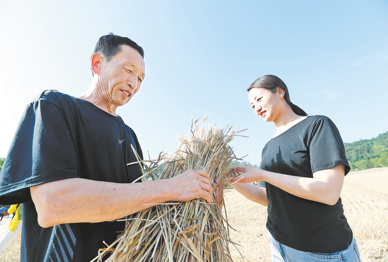如數(shù)家珍 原村委會主任陳伯平和現(xiàn)任村委會副主任張文娜交流小麥收成。