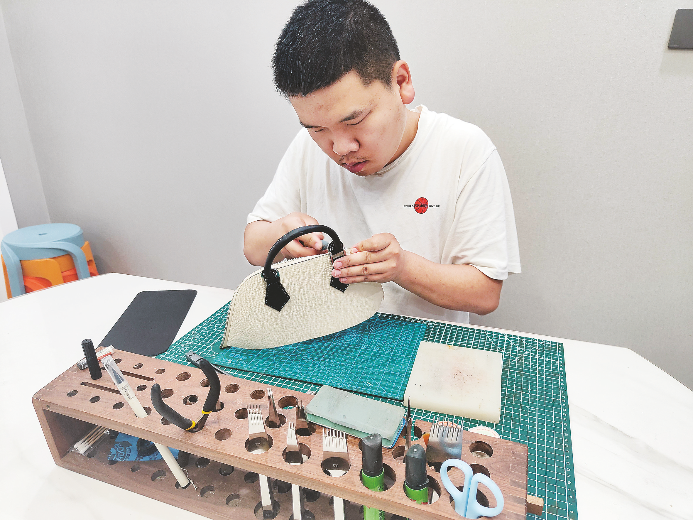 他堅(jiān)信勤能補(bǔ)拙,克服了一個(gè)又一個(gè)難題,終于做出了理想的包包。隨著一個(gè)又一個(gè)皮包制作成功,他的生活重心以及心性也隨之發(fā)生了很大的變化,許多親朋好友都收到了他的禮物,并得到了他們的激勵(lì)和贊賞,這讓他更有動(dòng)力去追逐夢(mèng)想。
