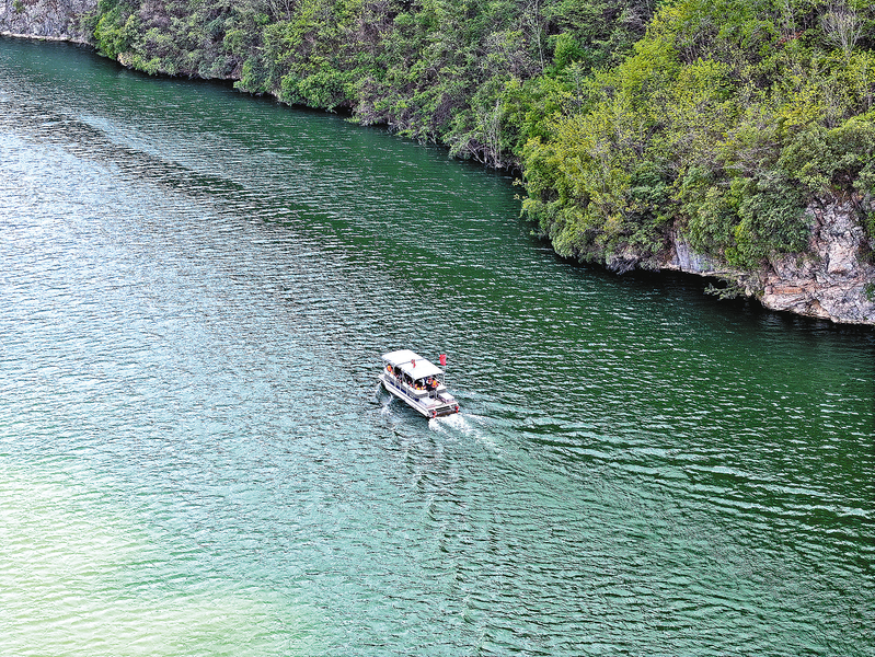 4月13日,一艘游艇在鎮(zhèn)安縣月河鎮(zhèn)羅家營水庫游弋。近年來,月河鎮(zhèn)依托羅家營水電站,打造“江南水鄉(xiāng)”鄉(xiāng)村游,配套發(fā)展民宿、農(nóng)家樂集群以及水上游樂項(xiàng)目吸引游客。 (本報(bào)通訊員 楊建東 攝)