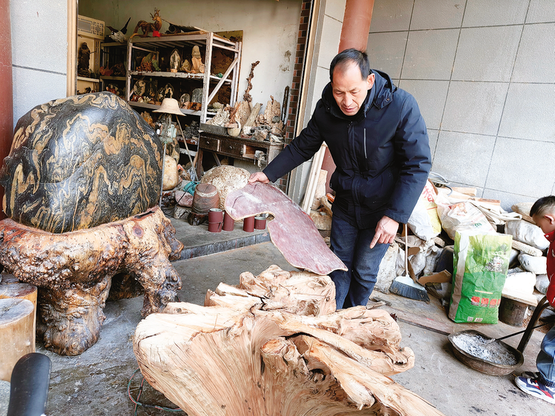 “這是我前兩天去旬陽(yáng)拉回來(lái)的老樹根,正準(zhǔn)備制作一個(gè)茶幾。”3月20日,鎮(zhèn)安縣金臺(tái)東路石根藝術(shù)工作室內(nèi),57歲的吳海石守著剛運(yùn)回的木料比比畫畫。他身后的平房里,屋角堆滿各式原石、枯木與石根藝術(shù)半成品,這個(gè)簡(jiǎn)陋的空間,是他的創(chuàng)作天地,也是他以斧鑿為筆,與秦嶺山石枯木對(duì)話的藝術(shù)主場(chǎng)。
