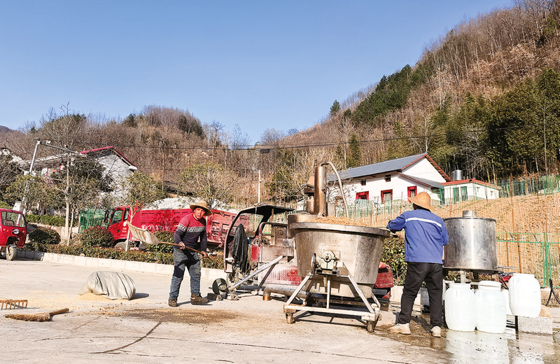 “春釀新醅邀日月,風(fēng)攜酒香漫山村”。仲春時(shí)節(jié),鎮(zhèn)安縣高峰鎮(zhèn)長(zhǎng)坡村,青山含黛,清泉潺潺。4月7日,和煦的陽(yáng)光灑進(jìn)長(zhǎng)坡村的一個(gè)農(nóng)家小院,作坊里熱氣氤氳,糧香、曲香交織彌漫。這里沒(méi)有春日的慵懶閑適,只有一派熱火朝天的忙碌——粉碎玉米的聲響、蒸煮糧食的沸騰聲、師傅們扯著嗓子的交談聲,匯成一曲春日生產(chǎn)的奮進(jìn)樂(lè)章。師傅們各司其職,從粉碎、拌曲到入缸、封窖,每一步都嚴(yán)謹(jǐn)細(xì)致,每一招都飽含匠心,將世代相傳的秦嶺古法釀酒技藝,在春光里演繹得淋漓盡致。