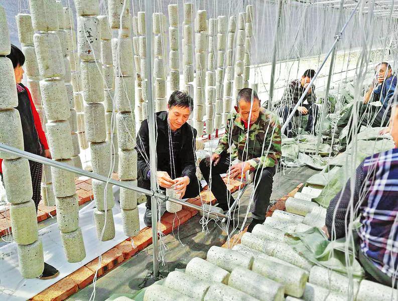 由村兩委利用產(chǎn)業(yè)資金委托集體經(jīng)濟組織建設(shè)大棚,統(tǒng)一采購菌袋,按照一戶貧困戶承包一個大棚、掛袋2萬袋左右的標(biāo)準(zhǔn),先期借給貧困戶進行種植,大棚及設(shè)施設(shè)備安全由各戶負(fù)責(zé)。村集體經(jīng)濟組織為貧困戶提供技術(shù)指導(dǎo)、生產(chǎn)設(shè)施設(shè)備、互助資金支持,村委會協(xié)助辦理貼息貸款。曹坪鎮(zhèn)在柞水縣產(chǎn)業(yè)辦的支持下,聘請東北專業(yè)技術(shù)指導(dǎo)員,在基地直接給老百姓傳授種植管理技術(shù)。由村集體建吊袋大棚,購置打孔機,建好噴灌設(shè)施,配齊吊繩掛扣、保溫膜,村委會協(xié)助缺資金的種植戶申請農(nóng)戶貸和互助資金,解決其資金困難。