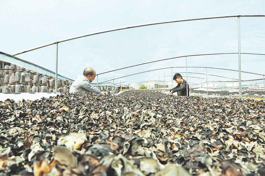 在金米村木耳大棚,村民鄒勝全和請來的幫工正在采摘木耳。