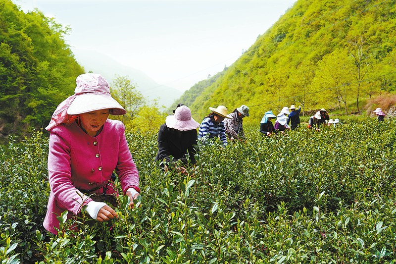 茶園里,成片的茶樹吐露嫩綠新芽,隨處可見采茶人忙碌的身影。
