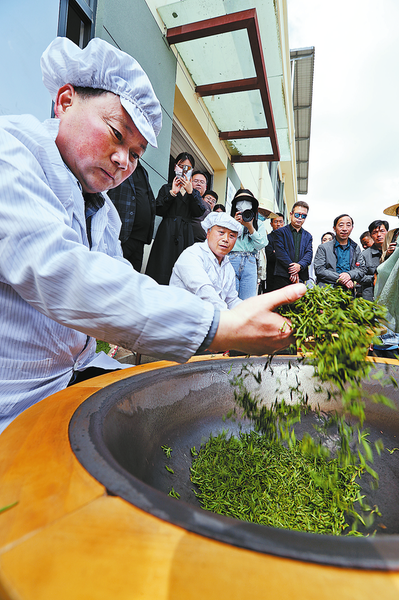 南京市高淳區(qū)援商技術(shù)人員、高級制茶師卜維梁現(xiàn)場教授制茶技藝。 (本報記者 方 立 攝)