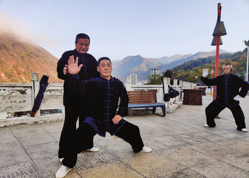 陳六一(左后)指導(dǎo)拳友練拳