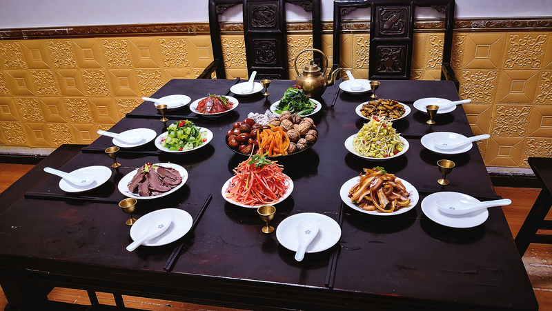 △“古鎮(zhèn)宴席三點水”的開席菜以八道涼菜為主,四葷四素環(huán)繞著中間的干果盤,形如蓮花綻放。