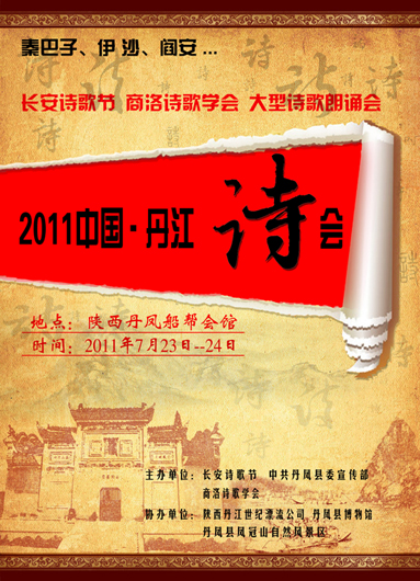為弘揚(yáng)商山詩(shī)歌文化,慶祝中國(guó)共產(chǎn)黨成立90周年,由長(zhǎng)安詩(shī)歌節(jié)、中共丹鳳縣委宣傳部、商洛詩(shī)歌學(xué)會(huì)共同舉辦的“2011中國(guó)·丹江詩(shī)會(huì)”大型詩(shī)歌朗誦會(huì)將于7月24日上午8時(shí)在船幫會(huì)館盛大開(kāi)幕,著名詩(shī)人秦巴子、伊沙、閻安等率長(zhǎng)安詩(shī)歌節(jié)與商洛詩(shī)歌學(xué)會(huì)會(huì)員,在歷經(jīng)百年風(fēng)華的船幫會(huì)館院內(nèi)唱響當(dāng)代詩(shī)歌幸福的聲音。